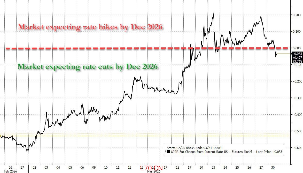如下图所示,上周初,期货市场定价年底前加息是板上钉钉的事,并直到上周五仍认为此举极有可能发生。然而在周一,情绪发生了巨大转变,以至于交易员一度认为年底前降息的可能性达到20%。