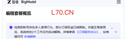 4月12日,他发现智谱coding plan套餐速率被限制,切换账号再次尝试后,却被提示“检测到账号存在多人使用行为,部分订阅权益已经被限制”,也就是“封号”。王先生向智谱申请解封,第二天又再次出现速率限制的问题。
