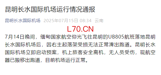 云南昆明长水机场一航班无法正常滑出跑道 无人员受伤
