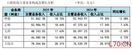 其次,占比最多的大综合业务也保持稳定增长趋势,2025年收入为7.83亿元,同比增长2.27%;修复业务收入为4.66亿元,同比微增0.72%;种植和儿科业务收入出现下滑,下滑幅度分别为2.08%和2.69%。