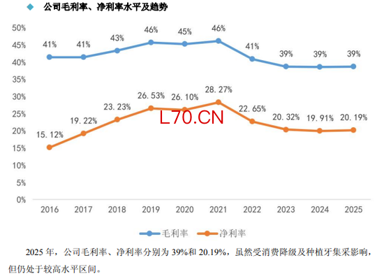 不过,拉长时间看,自2022年以来,通策医疗的净利润一直保持在5亿元左右,几乎是停滞不前,营收也维持在27亿元至29亿元的水平。2025年,受种植牙集采等影响,公司毛利率、净利率分别为39%和20.19%,相较于2021年的46%、28.27%下滑较多。