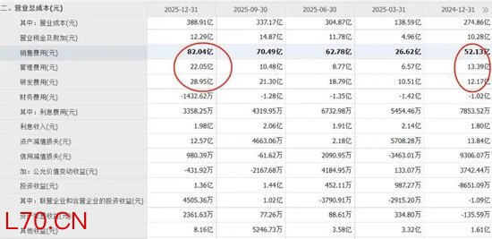2025年第四季度,赛力斯销售费用、管理费用、研发费用分别录得82亿、22亿及23亿元,同比增长了58%、68%及137%,均高于营收增速。