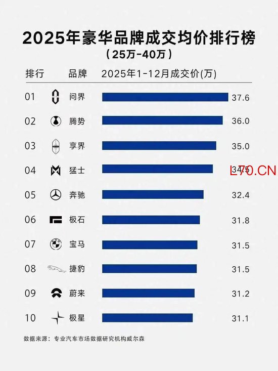 根据第三方机构威尔森的统计,在2025年中国市场汽车品牌成交均价排行榜中,问界均价约为37万元,位居第一。奔驰均价32.4万元,宝马均价31.5万元,奥迪跌出前十。不过这个榜单也有一定误导性,像极星和极石这类品牌,销量太低,不具备参考性。
